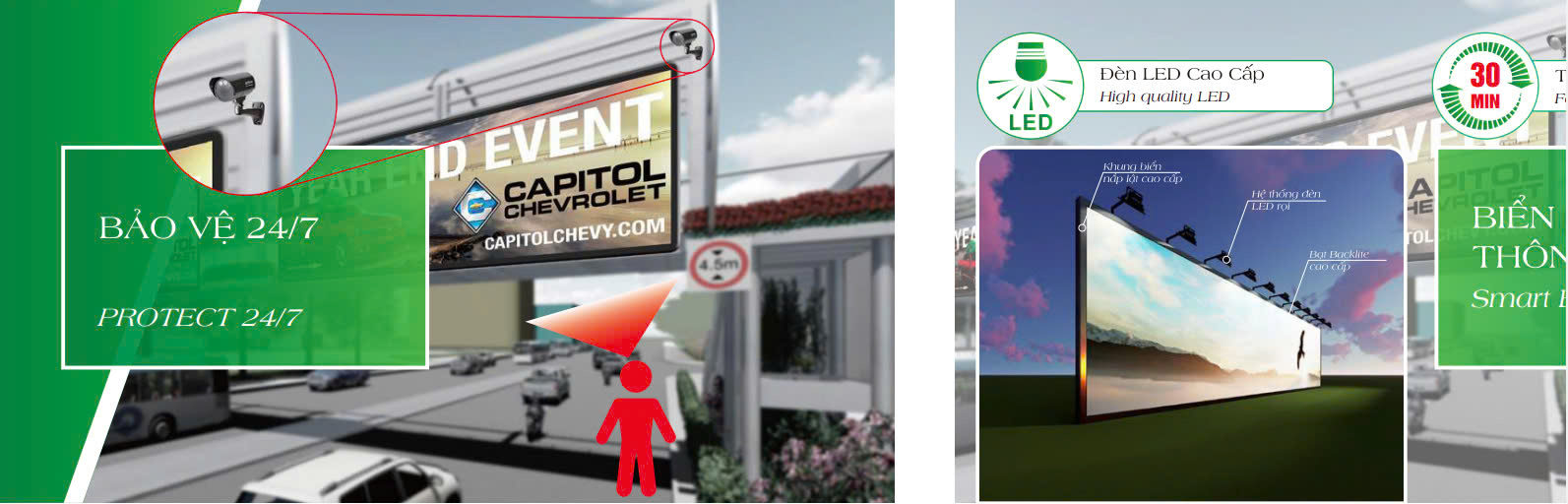 - Hệ thống biển quảng cáo được trang bị nắp lật thông minh và hệ thống đèn LED cao cấp, đảm bảo chiếu sáng tốt nhất trong mọi điều kiện thời tiết và thời gian trong ngày. Đặc biệt, mỗi biển quảng cáo đều có lắp đặt camera bảo vệ 24/7, đảm bảo an ninh và bảo trì.